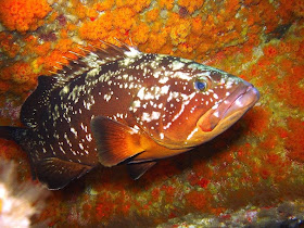 (Epinephelus itajara) Características: podem atingir grandes dimensões, pesando até 400 Kg e medindo 4,0 m de comprimento. Coloração olivácea-escura uniforme nos adultos, mas nos jovens pode-se notar pontos negros na cabeça e 5 faixas sobre o corpo. São marcados visivelmente por seus cabeça lisa e larga, espinhos dorsais curtos olhos pequenos e dentes caninos. A carne é muito apreciada. Habitat: águas costeiras com fundo de pedra e grandes tocas, até 100 m de profundidade. |